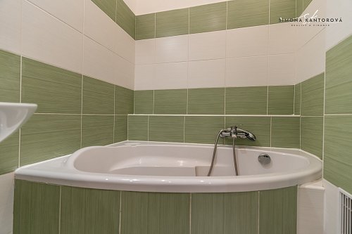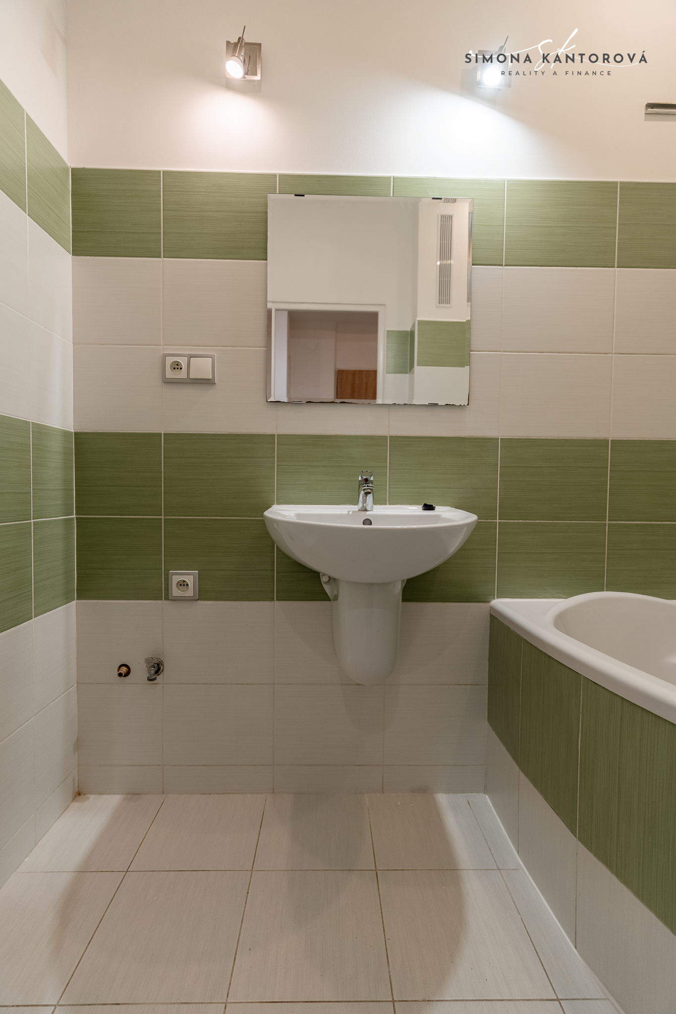 dodatečný prostor. Prostorná koupelna s vanou a připraveným místem pro pračku nabízí relaxaci i praktičnost v jednom.
